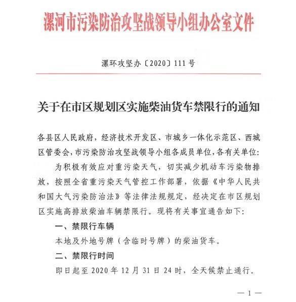 【卡车之家 原创】12月14日,漯河市污染防治攻坚战领导小组办公室发布通知,即日起至2020年12月31日24时,在城市规划区内的所有道路(不含高速公路)禁止所有柴油货车通行。
