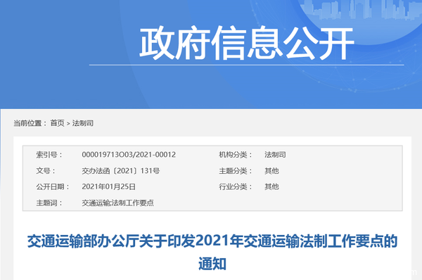 (二)积极推动行业重点法律法规立法进程。制定并实施《交通运输部2021年立法计划》。配合完成海上交通安全法、城市公共交通条例的颁布及实施宣贯工作。统筹推进公路法、收费公路管理条例和农村公路条例列入国务院年度立法计划,推动尽快出台。积极推动铁路法、道路运输条例、海商法、民用航空法、铁路交通事故应急救援和调查处理条例立法修法进程。