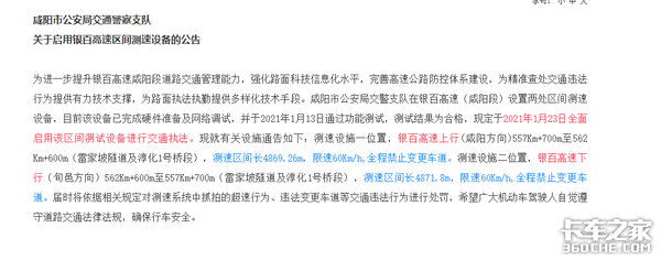 【卡车之家 原创】近日,陕西省咸阳市公安局交通警察支队发布通知,为进一步提升银百高速咸阳段道路交通管理能力,强化路面科技信息化水平,完善高速公路防控体系建设,在咸阳银百高速(咸阳段)设置两处区间测速设备。