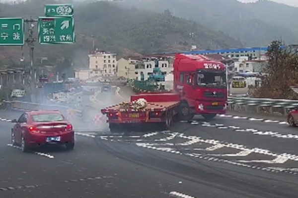 根据现场监控来看,由于事发突然,重型半挂车在紧急刹车之后,一时半会并没有将货车刹停。货车车头在撞上水马后直接向后扭转了180度,整个车身呈“7”字型,车后的挂车也在惯性作用下继续甩尾前冲,险些扫中红色小车。就在货车司机终于将车停稳之后,货车已经成“对折”姿态横在了车道上,但红色轿车车主对此视若无睹,停留了几秒之后直接驶离了现场。