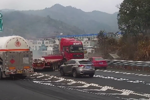 【卡车之家 原创】近日,在高速公路上发生了这样危险的一幕:一辆正在行驶的红色小轿车在开至高速分叉口处时,忽然减速并右向变道,随后就停在了高速公路上,这时同向车道又驶来了一辆重型半挂车,在千钧一发之际,半挂车紧急制动并向右打方向避让,直接刹出了“青烟”。