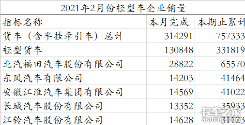 2020年12月份轻型货车完成销量190209台次,而仅以北汽福田汽车股份有限公司、东风汽车集团有限公司、长城汽车股份有限公司为首的前三甲销售数据,就贡献了112383台次的销量。2021年2月份,轻型卡车销售量为130848台次,前三甲贡献了57594台次的销售数据,排名靠前的车企销售数据的极差逐渐减小。