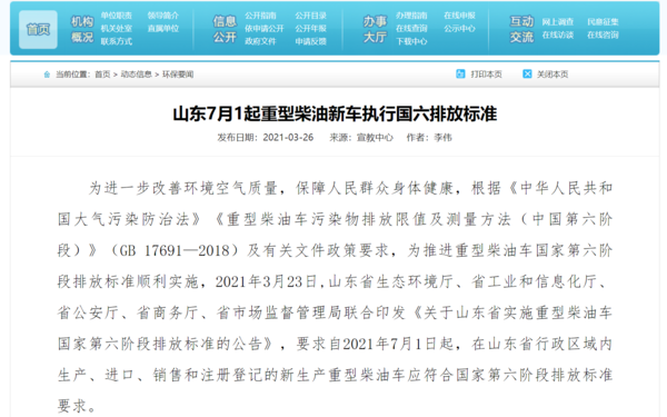 2021年3月23日,山东省生态环境厅、省工业和信息化厅、省公安厅、省商务厅、省市场监督管理局联合印发《关于山东省实施重型柴油车国家第六阶段排放标准的公告》,要求自2021年7月1日起,在山东省行政区域内生产、进口、销售和注册登记的新生产重型柴油车应符合国家第六阶段排放标准要求。