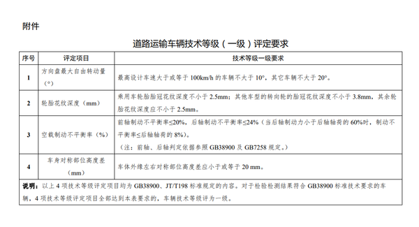 2、GB38900标准是保障“三检合一”政策落地实施的重要支撑,将于2021年1月1日起正式实施,《道路运输车辆综合性能要求和检验方法》(GB18565—2016)将同时废止。其中,检验检测结果符合GB38900标准的,车辆技术等级定为二级;在此基础上,方向盘最大自由转动量、轮胎花纹深度、空载制动不平衡率、车身对称部位高度差等4项指标满足《道路运输车辆技术等级(一级)评定要求》(见附件)规定要求的,车辆技术等级定为一级。道路运输车辆技术等级评定周期与机动车安全技术检验周期保持一致。