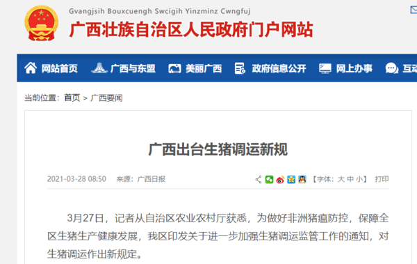 ● 广西:4月起暂停外省生猪调入 中南区种猪和仔猪可点对点调运