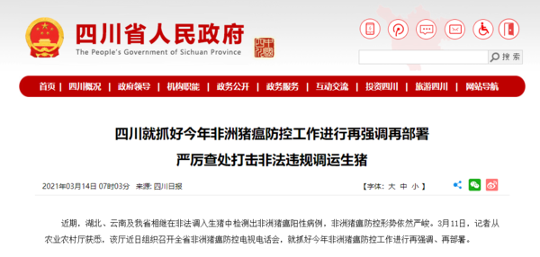 四川省召开专项会议,要求要严格调运监管,全面禁止从省外违规调运生猪,严厉查处打击非法违规调运生猪行为。