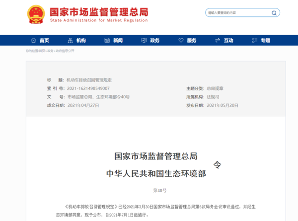 【卡车之家 原创】日前,市场监管总局、生态环境部40号令表示,《机动车排放召回管理规定》自2021年7月1日起施行,凡是机动车有排放达标等3种行为之一的,生厂商必须召回,进口机动车的进口商也包括在内。