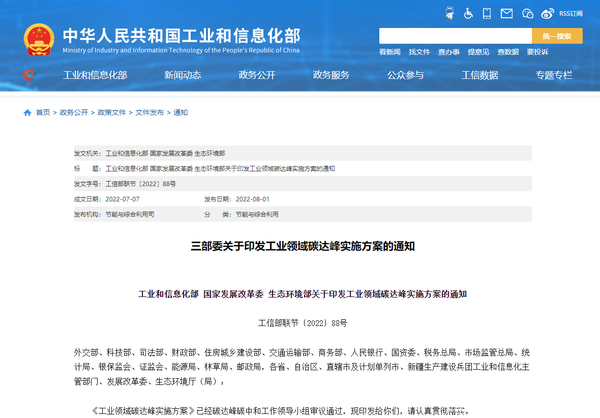 近日,工业和信息化部、国家发展改革委、生态环境部三部委关于印发工业领域碳达峰实施方案的通知发布,方案从总体目标、重点任务、重大行动等方面做出逐一说明。