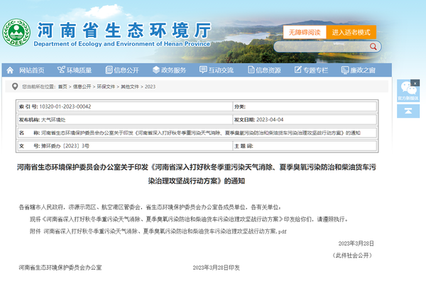 近日,河南省生态环境保护委员会办公室 发布《河南省深入打好秋冬季重污染天气消除、夏季臭氧污染防治和柴油货车污染治理攻坚战行动方案》的通知。