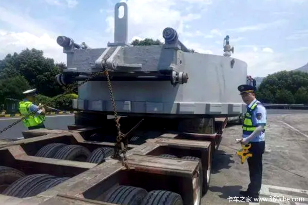 两辆货车分别运载蒸机室和硫化机,均未办理超限运输通行证。现场执法人员用卷尺测量车货长度,结果显示货车上的装载物严重超出了限定的宽度。此类货车限定宽度为2.55米,车货实际宽度分别达到4.5米和4.3米,这两辆货车的超限率在170%左右。