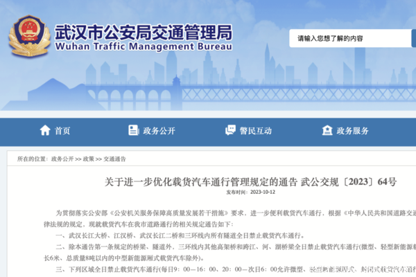 10月12日,武汉公安局交通管理局发布《关于进一步优化载货汽车同行管理规定的通告》(以下简称《通告》),事关载货汽车、老旧柴油货车、渣土运输车、混凝土搅拌车、危险化学品运输车等。