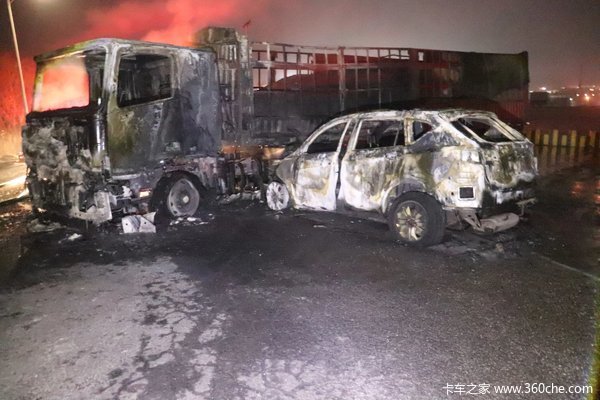 之后,半挂车便驶入了事故现场,在事故现场停了40秒,同时,白色越野车由东向西径直驶入事故现场,并与停驶的半挂车发生碰撞,随后车辆起火燃烧。