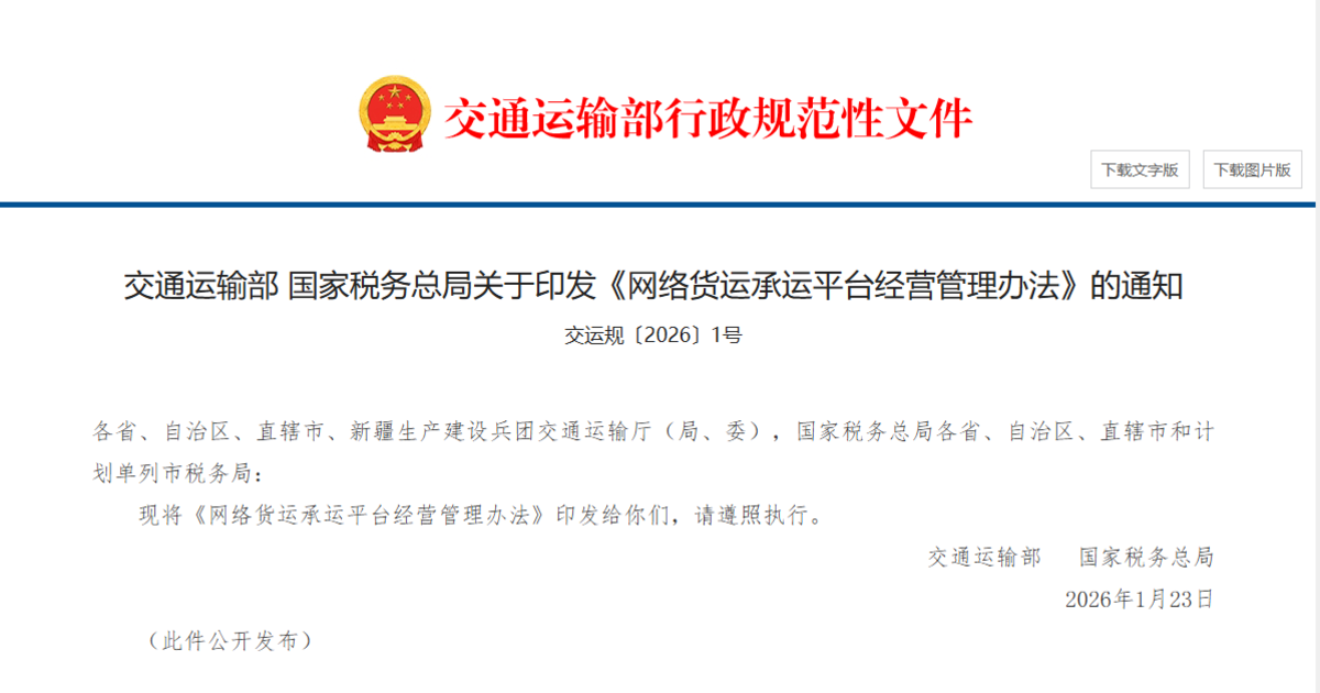 近日,交通运输部会同国家税务总局联合发布《网络货运承运平台经营管理办法》,正式取代已施行七年的暂行办法,成为长期有效的行业监管规范。