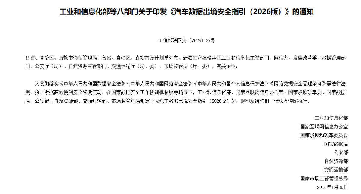 2026年2月,工业和信息化部等八部门联合印发《汽车数据出境安全指引(2026版)》(以下简称《指引》),作为我国汽车行业首个专门的数据出境安全规范性文件,其以“安全与便利并重”为核心,将上位法要求转化为行业可落地的操作细则。
