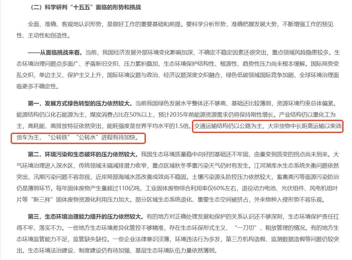 生态环境部官方定调(2026年1月),我国交通运输结构仍以公路为主,大宗货物中长距离运输以柴油货车为主,“公转铁”“公转水”进程有待加快;“十五五”期间将加快‘公转铁’‘公转水’整体进程,从源头减少污染物和碳排放。