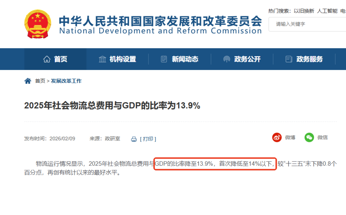 光明日报/国家发展改革委数据(2026年2月),2025年我国社会物流总费用与国内生产总值(GDP)的比率降至13.9%,首次低于14%,较“十三五”末下降0.8个百分点,再创有统计以来最好水平,而这一成果的重要支撑的就是运输结构优化——“公转铁”“公转水”加快推进,带动综合运输效率提升、物流成本下降。数据显示,2025年水运货运周转量占比持续保持在50%以上,国家铁路公铁联运量同比增长超过130%,大宗物资和长距离运输正加速向更经济、更绿色的铁路、水路转移。