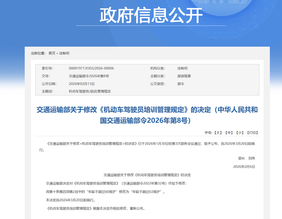 2月6日,交通运输部的一则重磅消息,像一缕春风吹遍了全国3800万货车司机群体——一口气公布5个修改决定,从第4号令到第8号令,覆盖道路运输从业人员、货物运输及站场、危险货物运输等多个领域,核心一条就是:将经营性道路客货运输驾驶员等相关从业人员的年龄要求,统一调整为“年龄不超过63周岁”,3月20日起正式施行。