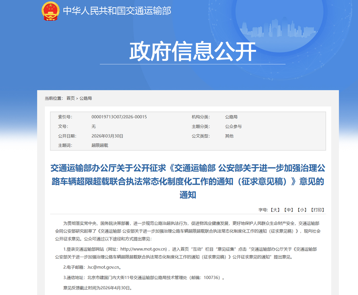 2026年3月30日,交通运输部办公厅发布通知,就《交通运输部 公安部关于进一步加强治理公路车辆超限超载联合执法常态化制度化工作的通知(征求意见稿)》(简称《征求意见稿》)向社会公开征求意见,意见反馈截止时间为2026年4月30日。