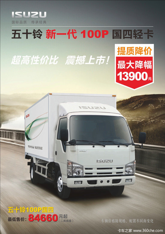 此次促销的车型为五十铃厢式运输车 100P,动力方面,搭载4JB1CN发动机,符合国四排放,变速箱型号为MSB-5MT,速比6.142。另外,该车选用的是限4米箱车和轴距在3360的底盘车。感兴趣朋友欢迎致电经销商。最终活动解释权上海众铃所有。