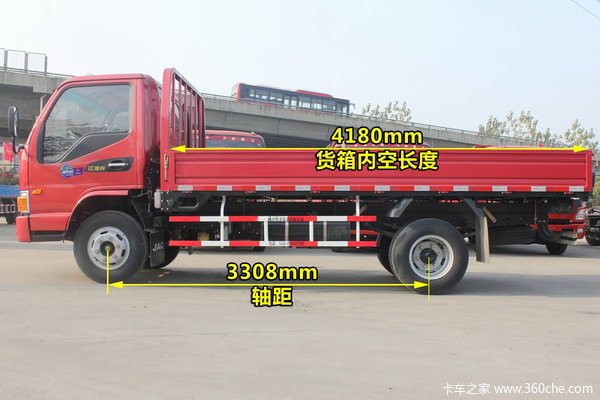 江淮骏铃采用了3308轴距,单排货箱内空长度为4180,排半货箱内空长度为3850。国四排放标准,核定准载为1.79吨,在成都上“川A”的轻卡蓝牌照和申办入城证没有问题。