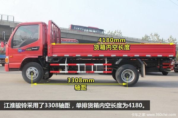 江淮骏铃采用了3308轴距,单排货箱内空长度为4180,排半货箱内空长度为3850mm。国四排放标准,核定准载为1.79吨,在成都上“川A”的轻卡蓝牌照和申办入城证没有问题。