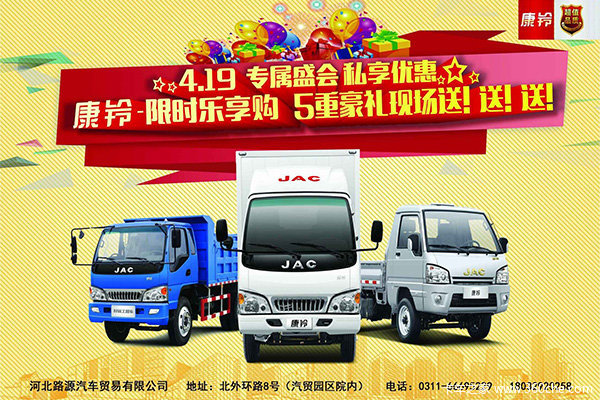 2015年4月19日,河北佳豪汽车贸易有限公司于河北路源江淮专卖店举办“康玲限时乐享购 5重豪礼现场送”活动。