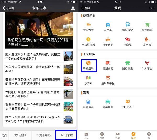 1、关注卡车之家微信公众号(微信直接搜索卡车之家或my360che),在右下方点击论坛货源,可以看见司机招聘,再点击进入即可看到实时招聘信息。