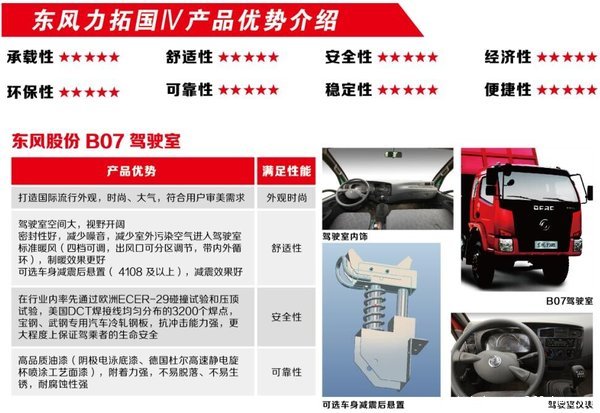 东风力拓是东风汽车股份有限公司旗下一款中高端中轻型工程自卸车,执行国IV排放标准,整车设计理念遵循标准化、模块化、通用化设计理念和一体化设计原则;底盘与上装、底盘与驾驶室同步设计、开发、实现整车无缝链接和整车性能最佳匹配;车辆风格统一,整车专用件品种减少,车辆性能稳定,品质更有保障,降低制造成本和售后维修成本。