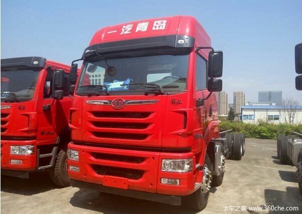 青岛解放 途V准重卡 350马力 9500轴距 载货车底盘装配途V高顶平地板驾驶室驾驶室,动力方面,搭载锡柴CA6DL1-35E4发动机,输出功率为350马力,符合国四/欧四排放,匹配法士特变速箱,档位数为12,采用457冲焊后桥,速比为4.111,对该款新车有购买意向的用户欢迎致电经销商。