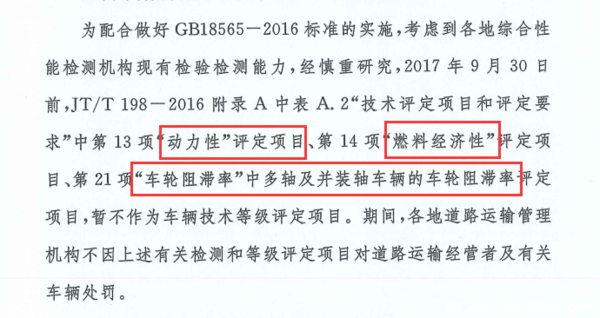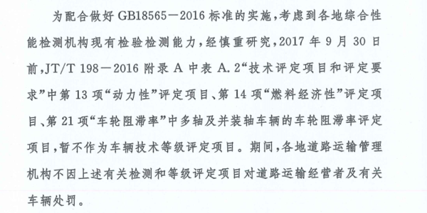 近日,交通部下文在2017年9月30日前,对JT/T198—2016附表A中的“动力性”、“燃油经济性”、“车轮阻滞率”中多轴及并装轴车辆的车轮阻滞率评定项目,暂不作为车辆技术等级评定项目。期间,各地道路运输管理机构不因上述有关检测和等级评定项目对道路运输经营者及有关车辆处罚。
