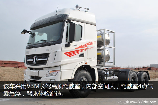 北奔V3M LNG牵引车采用V3M高顶驾驶室、457单减桥、法士特变速箱、1000L大容积气瓶等设计,贯彻安全、快捷、高效、舒适、环保、节能的设计理念,在为客户提供最大安全保障的同时,极力创造环保舒适的环境。动力方面搭载潍柴发动机,最大输出380马力。