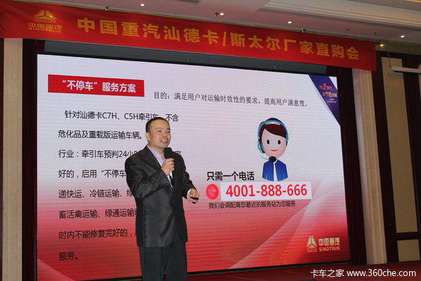 中国重汽商用车销售部董圣朝经理对嘉宾们的到来表示热烈的欢迎,感谢大家对重汽商用车的信任和支持!随后,董经理对汕德卡和新斯太尔这两个品系的车型优势和特点进行了精彩详细的讲解。近期,国家对京津冀及周边的煤炭运输行业下发了新政策,即LNG燃料替代柴油,中国重汽商用车未雨绸缪,生产的LNG牵引车技术成熟、节油高效!通过山西运煤专线的实例举证和精准的数据分析,给用户深入浅出的讲解了重汽车动力强而又省运费的原理!嘉宾们对“高大上”的汕德卡和升级曼平台的新斯太尔有了更深入的了解!百万公里的品质保证和“不停车”的亲人服务让用户完全无后顾之忧!纷纷订车!