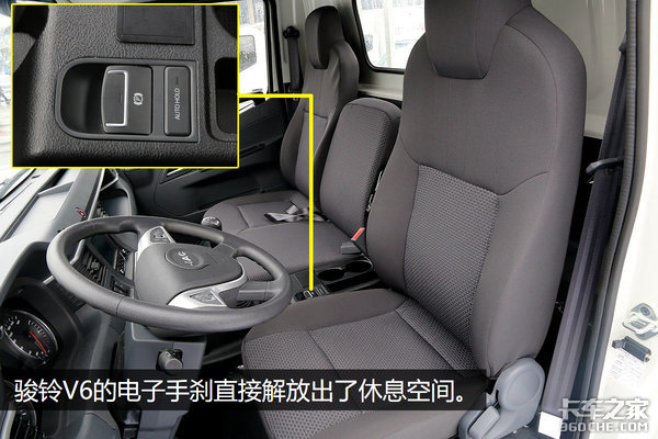 前不久江淮也展出了骏铃V6,该车采用了电子驻车系统,一个小小的按钮,也彻底解放出了休息空间。