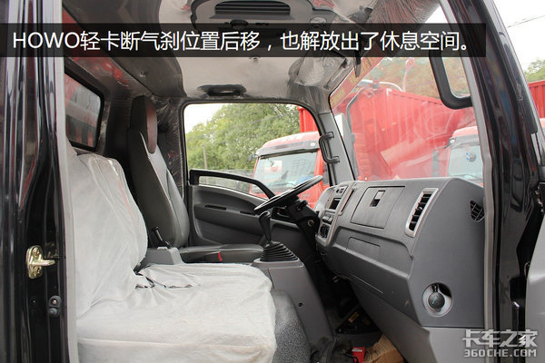 除了档杆位置移到仪表台上外,目前很多轻卡的档杆位置已经比较靠前了,但这个时候负责驻车制动的手阀又会影响到躺下去的舒适性,重汽HOWO轻卡的断气刹手阀位置就设计的非常靠后,挨着桌椅靠背,尽管操作上会有些不便,但这样中间就腾出了躺下休息的区域,正常人躺下去还是没问题的。