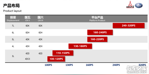 目前道依茨一汽大柴车用柴油机拥有C、D、H、K四大产品平台,排量3-7L,功率覆盖40~320马力,能充分满足一汽解放中轻卡,以及非道路工程机械与一些客车厂家的发动机使用需要。