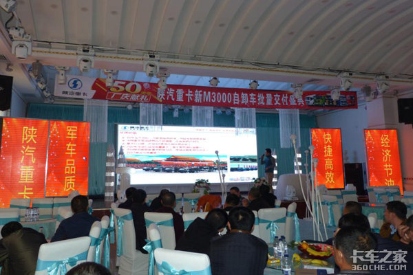 【卡车之家 原创】哈尔滨润发汽车销售有限公司携手七台河永泰汽贸,于2017年11月10日下午在七台河市赫拉宫邸大酒店,举办了一场盛大的陕汽重卡新M3000自卸车首批20辆车的批量交付盛典,暨购车用户售前培训活动。