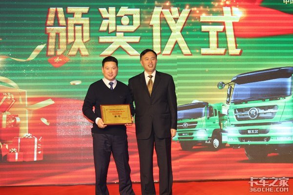 中国重汽商用车销售部总经理助理兼苏浙皖大区经理万海先生向盐城市盛亚汽车销售有限公司董事长张军先生颁发“突出贡献奖”证书。
