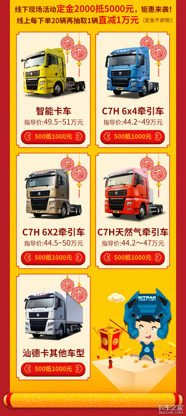 只要在2月25日~3月15日这段时间内,于卡车之家团购页面下单订购汕德卡指定车型(包括:智能卡车、C7H 6X2、C7H 6X4、C7H LNG 等)就能享受定金膨胀的福利,支付500元定金(定金不可退)可当1000元购车款使用。