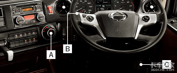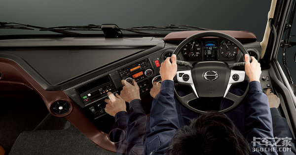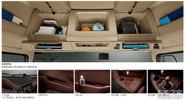 得益于高顶驾驶室的设计,日野Profia牵引车顶部集成了三大两小的储物箱、以及左右两边、中控台上方、下方,还有车门板等等,可以说储物空非常丰富,完全满足司机的日常储物需求。