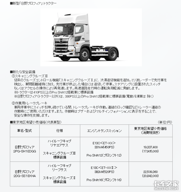 看完了对日野Profia牵引车的介绍,相信卡友对该车也有一定的认识。首先舒适性、动力性以及安全性方面得到了全面升级,配置也相当高,但价格也并不便宜哦!根据日野官网上显示,该车搭载520马力匹配16挡AMT的车型的指导含税价为22509360日元,相当于人民币130万左右。如果广汽日野引进这款最新牵引车至广州工厂生产,不知道市场会是怎么样呢?(文/ 马计纳 图/ 日野官网)