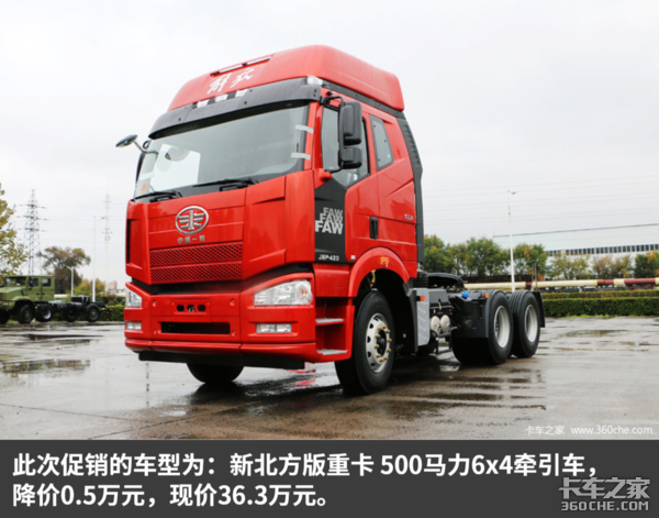 此次促销的车型为:新北方版重卡 500马力6x4牵引车,降价0.5万元,现价36.3万元。