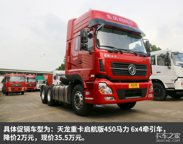 具体促销车型为:天龙重卡启航版450马力 6x4牵引车,降价2万元,现价35.5万元。