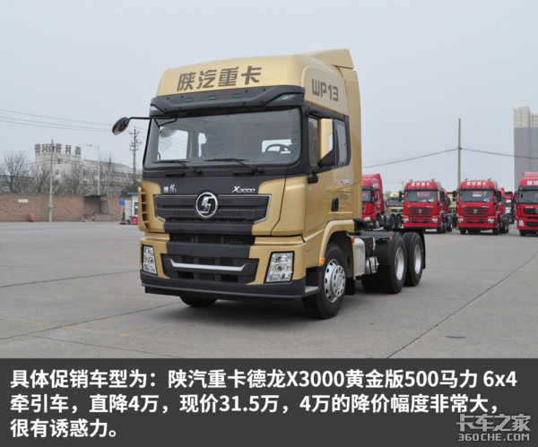 具体促销车型为:陕汽重卡德龙X3000黄金版500马力 6x4牵引车,直降4万,现价31.5万,4万的降价幅度非常大,很有诱惑力。