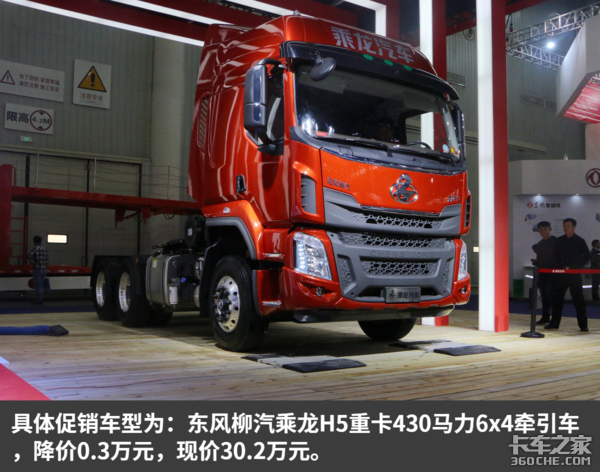 具体促销车型为:东风柳汽乘龙H5重卡430马力 6x4牵引车,降价0.3万元,现价30.2万元。