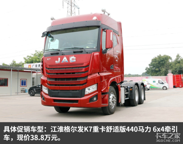 具体促销车型:江淮格尔发K7重卡舒适版440马力6x4牵引车,现价38.8万元。
