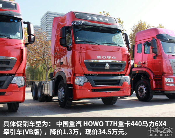 近日,山西省一家重汽HOWO经销商推出了T7H的相关促销政策,具体促销车型为: 中国重汽 HOWO T7H重卡440马力6X4牵引车(VB版) ,降价1.3万,现价34.5万元。