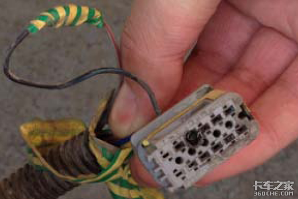 3) 拆下尿素泵接插头,发现接插件锁紧片丢失,且端子有烫过痕迹,询问得知此接插件被烧蚀过,简单处理继续使用;