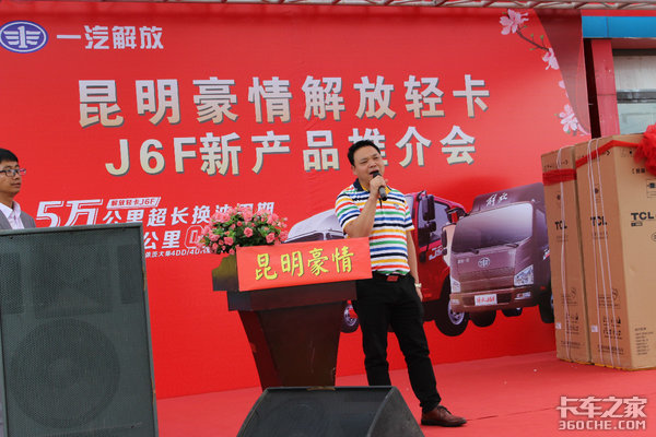 昆明豪情汽车销售有限公司总经理李飞上台致词,昆明豪情汽车销售有限公司不仅是一汽解放轻卡J6F/麟VH系列昆明区域代理商,同时也是一汽解放轻卡授权核心服务站,云南省一汽解放轻卡备品中心库。同时介绍了一汽解放轻卡J6F系列车型未来发展方向,新产品潍柴2.3小动力价格实惠的车辆已大量到货!接下来锡柴不烧尿素的产品将于10亮相昆明!产品将从75匹马力到180匹马力动力段将更丰富,满足卡友更多需求。昆明豪情致力于打造更强大的销售服务一体化团队!竭力保证让每一个用户用车无忧!昆明豪情期待您的加入!