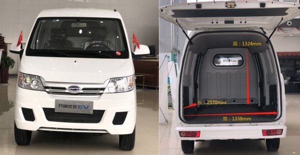 优优EV外观为传统微面造型,采用封闭式车厢设计,后排车窗为盲窗式,车身结构为5门2座版车型,车辆两侧均配有侧滑门,装载小件货物时将更加快捷方便。