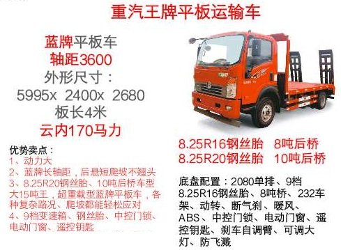 重汽王牌蓝牌平板运输车在此之前仅有一个配置:云内130马力、8挡变速箱、2.7T/8T前后桥、3360mm轴距、8.25R16轮胎、232大梁。